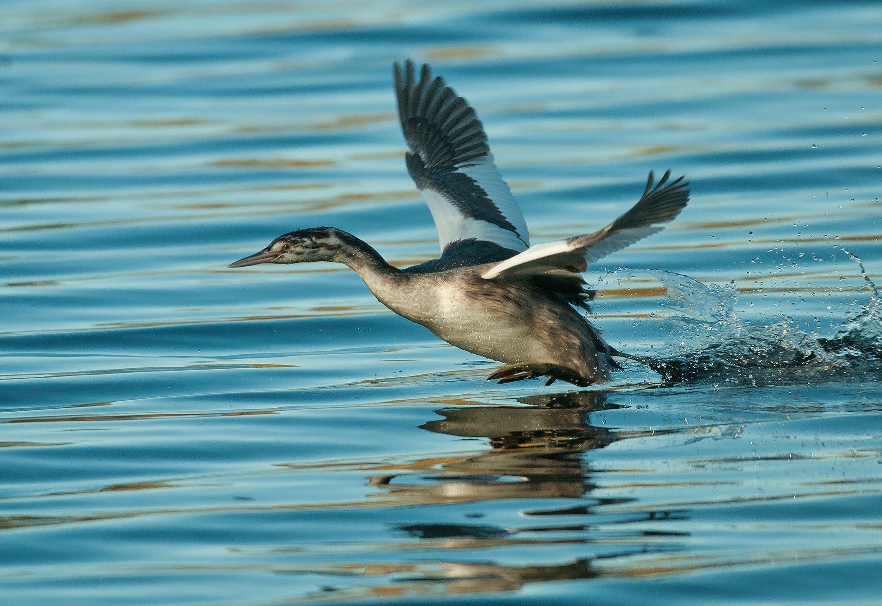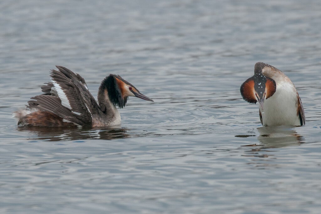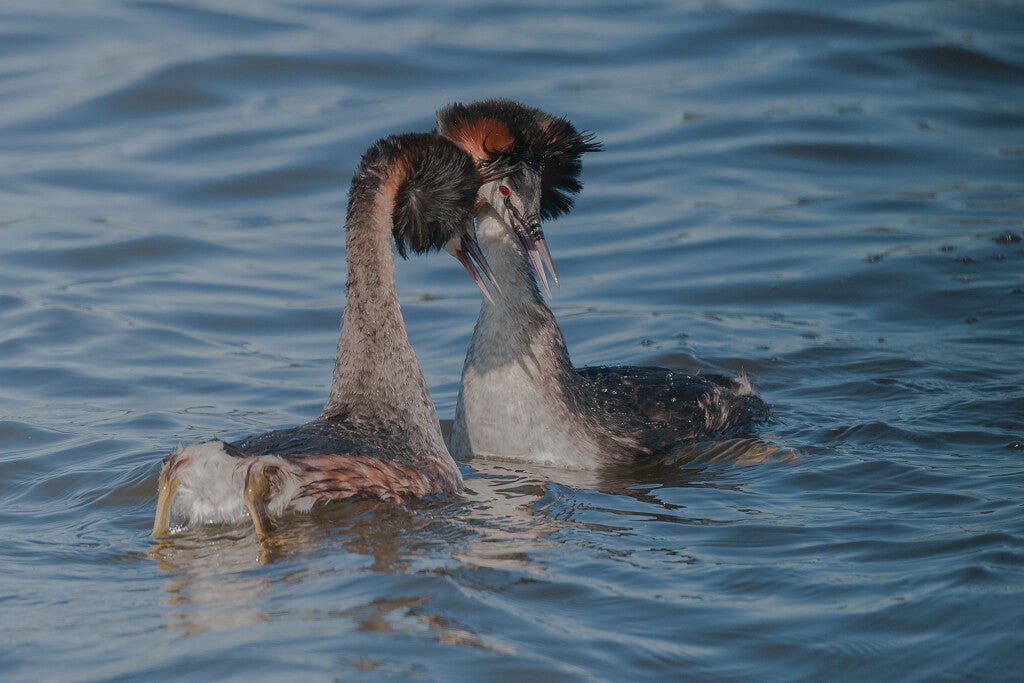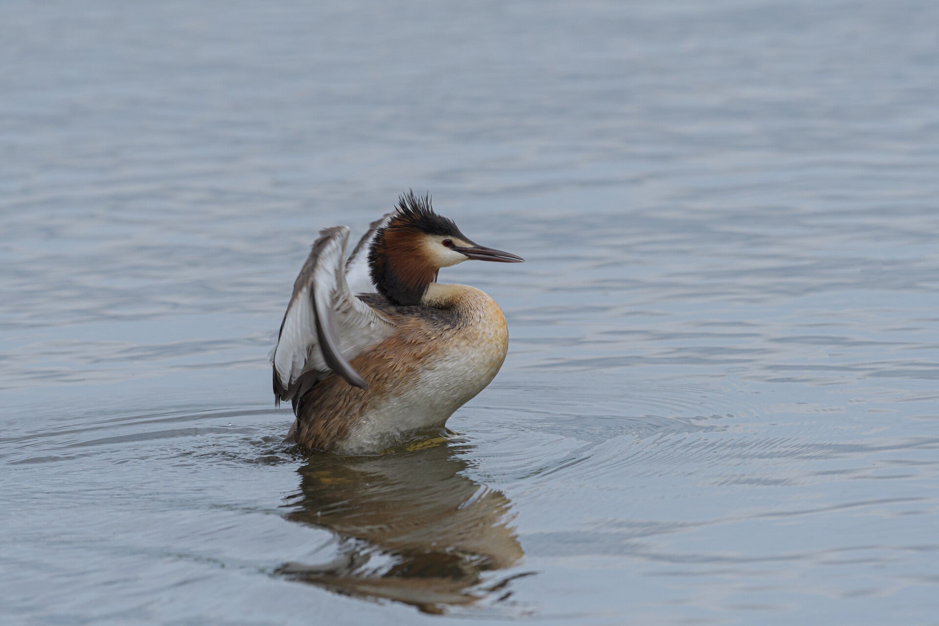 (Podiceps cristatus). De fuut, die behoort tot de familie Podicipedidae, is een kenmerkende watervogel welke voornamelijk voorkomt in habitattypen zoals plassen en meren. Deze soort wordt gekarakteriseerd door zijn markante donkere oorpluimen en een helder wit gezicht, omlijst door een opvallende roodbruine en zwarte kraag. Deze kraag is met name tijdens de balts periode zeer prominent zichtbaar en draagt bij aan het unieke en goed herkenbare uiterlijk van de fuut.