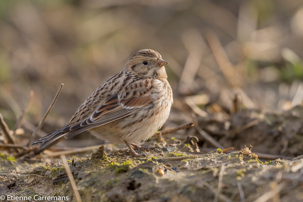 De bovenzijde van het lichaam is bruin met donkere lengte strepen. De staart is donker en wanneer hij vliegt vallen de witte buitenranden op. De vrouwtjes zijn onopvallend groenbruin van kleur, maar met ee geel accent aan de onderkant. In het winterkleed lijken de vrouwtjes en mannetjes op elkaar.